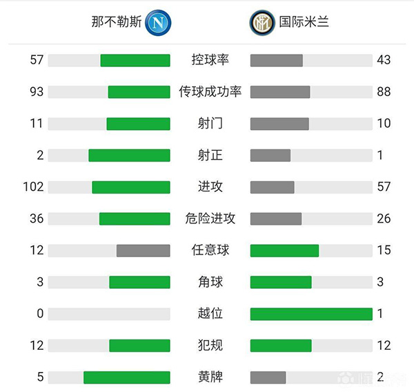 全场比赛结束,国米1-1战平那不勒斯。