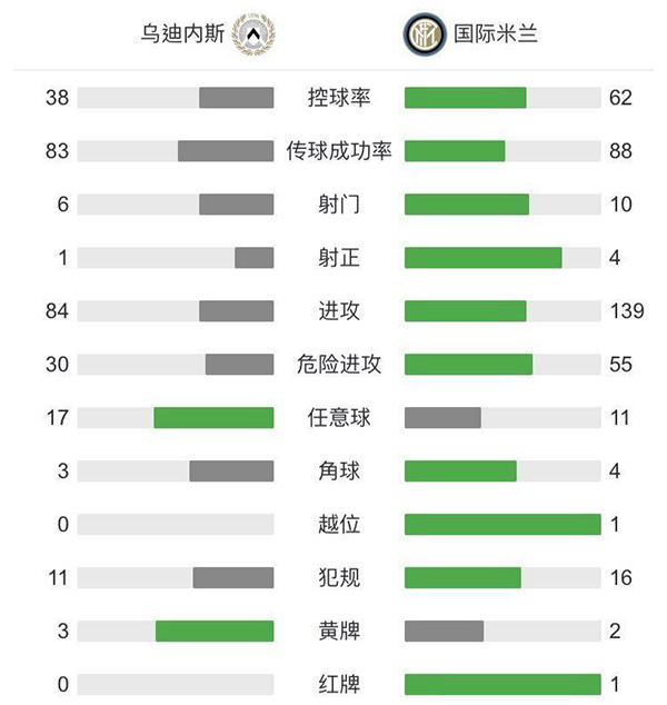 全场比赛结束,最终国际米兰客场0-0战平乌迪内斯。