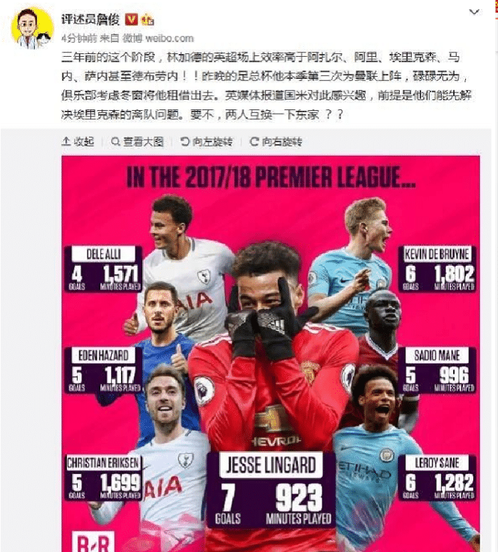 而著名解说员詹俊老师也对这笔交易发表了看法,詹俊老师表示:【三年前的这个阶段,林加德的效率要高于德布劳内、阿里、埃里克森、马内等球员。传闻曼联要租借林加德,国米要送走埃里克森,要不两家互换一下看看?】随后,詹俊老师晒出三年期同期的数据对比,林加德出场923分钟打进7球,效率真的超过德布劳内、阿扎尔等诸多球星。当然,那是因为詹俊老师没晒助攻数据。