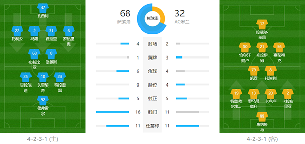 萨索洛首发:47-孔希利、2-马隆、22-托尔扬(61'17-穆尔杜)、31-费拉里、6-罗戈里奥(46'77-凯里科普洛斯)、23-特劳雷、8-洛佩斯、68-博拉比亚、10-久里契奇(56'7-博加)、92-德弗雷尔(46'9-卡普托)、25-贝拉尔迪