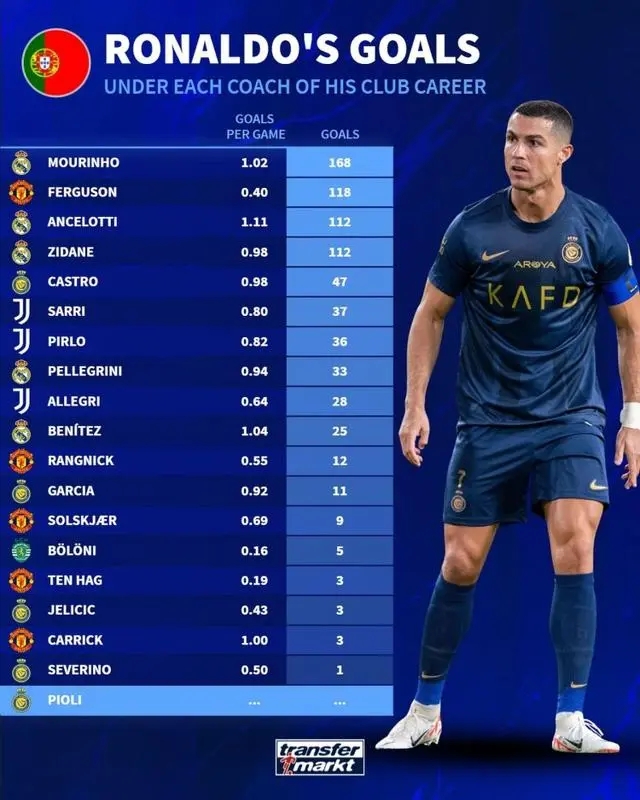 24直播网讯 德转统计C罗俱乐部生涯在历任主帅执教下的进球数和场均进球数,穆里尼奥执教下168球最多,滕哈赫执教下3球: