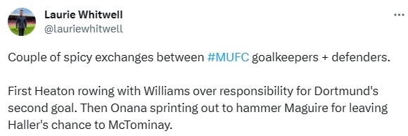 中场休息后,滕哈格让新门神奥纳纳替换下了老门将希顿。比赛第48分钟,曼联后防再次给了多特蒙德太大的空间,中锋阿莱获得单刀机会,若非奥纳纳奉献神扑,曼联球门将会再次失守。
