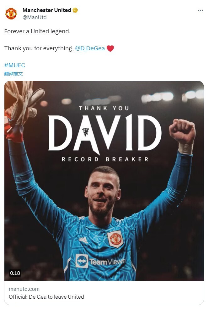 在德赫亚发文告别后,曼联官方也第一时间发文向他致敬:永远的曼联传奇,谢谢你做的一切。曼联主帅滕哈格则同样发声感谢德赫亚:“他将永远被人们铭记为俱乐部历史上最好的门将之一。所有球员和工作人员都向他致以最良好的祝愿,祝愿他下一阶段的出色职业生涯。”