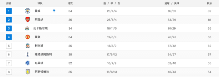 24直播网05月08日,英超联赛第35轮结束了两场焦点战角逐。最终曼联客场0-1输给西汉姆联,而纽卡斯尔则主场0-2被阿森纳终结了3连胜的步伐。在纽卡和曼联先后输球后,本赛季英超争四悬念重新燃起。