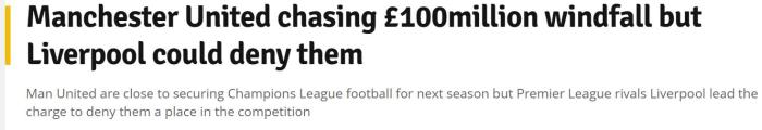 因此,曼联与利物浦的争四双红会,不仅是荣誉之争,更关乎利益,这是一场1亿英镑之战。