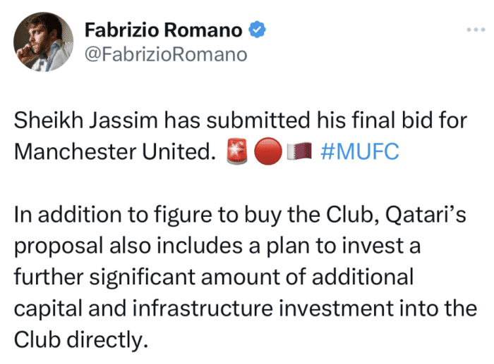 24直播网04月29日讯 凌晨,来自天空体育、talkSPORT等多家权威英媒的最新消息,卡塔尔财团已经提交了对曼联收购的最终报价,这份报价超过50亿英镑。如果报价被接受,这将成为史上最大的一笔体育俱乐部交易。