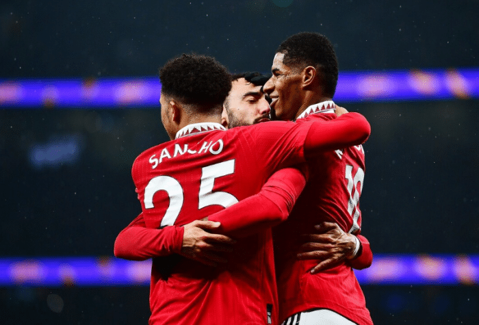 曼联主帅滕哈格此役安排了4231的体系,拉什福德出任中锋,桑乔、B费、安东尼组成三前卫,埃里克森、卡塞米罗搭档双后腰,达洛特、卢克-肖、林德洛夫、万-比萨卡搭档四后卫,其中卢克-肖客串中卫,德赫亚担任门将。热刺的首发阵容由孙兴慜、凯恩、里沙利松3人领衔。