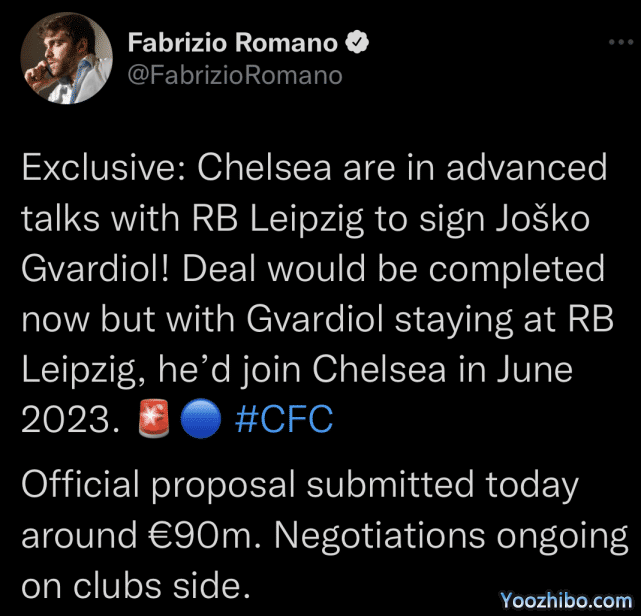 24直播网08月31日讯 凌晨,来自意大利天空体育著名记者Fabrizio Romano的独家报道,切尔西正在就克罗地亚国脚中卫格瓦迪奥尔的交易,和莱比锡红牛队进行深入谈判。