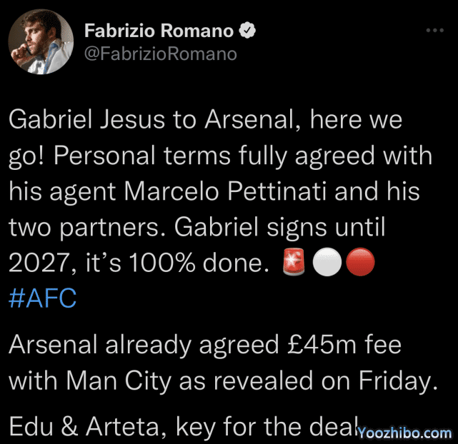 24直播网06月27日讯 日凌晨,知名转会专家罗马诺在个人社交账号上确认,巴西射手热苏斯的经纪人已经与阿森纳俱乐部达成协议。双方将签约5年至2027年。而热苏斯也将成为继马尔基尼奥斯和法比奥-维埃拉之后,阿森纳夏窗的第三位新援。