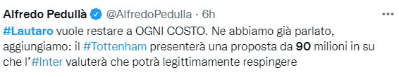 24直播网06月17日讯 意大利名记佩杜拉消息,热刺准备以超过9000万欧元的价格报价劳塔罗。