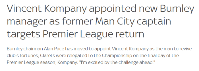 24直播网06月15日讯伯恩利在上赛季最后一轮从英超降级,球队炒掉了功勋主帅戴奇,临时主帅没能力挽狂澜,俱乐部随后任命孔帕尼为新主帅。