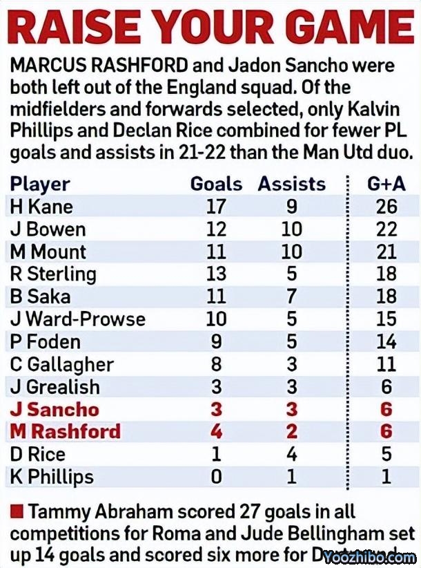英国《每日邮报》列出的数据显示,在索斯盖特征召的英格兰队中前场球员里,只有后腰德克兰·赖斯(5次)和卡尔文·菲利普斯(1次)的进球助攻次数低于拉什福德和桑乔(6次)。
