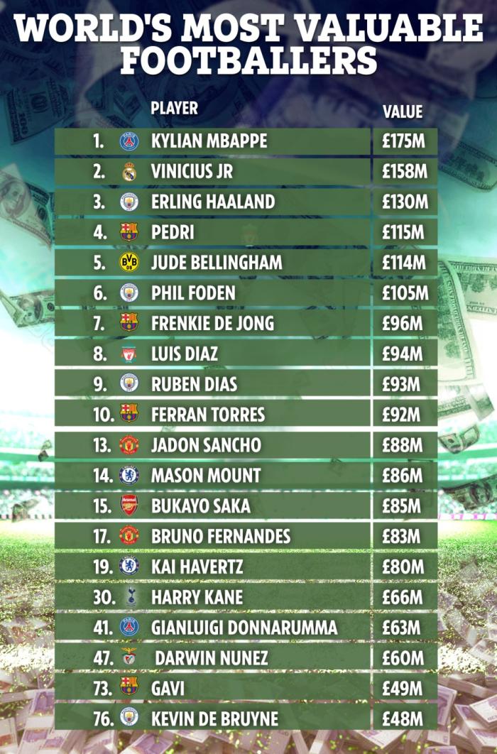 姆巴佩估值2.056亿欧元,遥遥领先维尼修斯的1.853亿欧元,哈兰德只有1.526亿欧元。巴萨的佩德里(1.351亿欧元)、多特蒙德的贝林厄姆(1.337亿欧元)、曼城的菲尔·福登(1.24亿欧元)、巴萨的弗兰基·德容(1.125亿欧元)、利物浦的路易斯·迪亚斯(1.1亿欧元)、曼城的鲁本·迪亚斯(1.096亿欧元)和巴萨的费兰·托雷斯(1.095亿欧元)跻身前十。