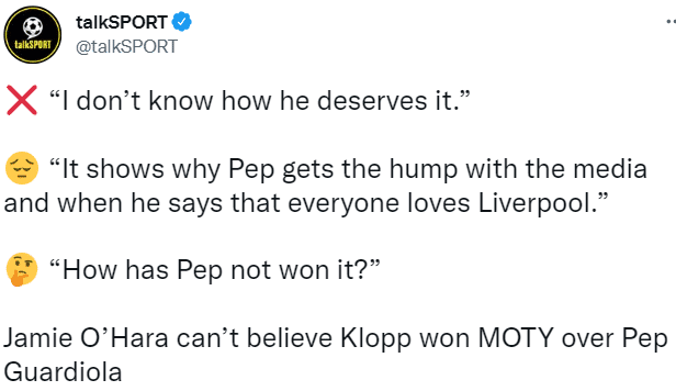 克洛普今天获得了2021-22赛季英超联赛年度最佳主教练,奥哈拉表示:“看不懂,克洛普凭什么获奖?瓜迪奥拉才是联赛冠军,这完全不可接受。”