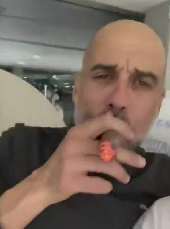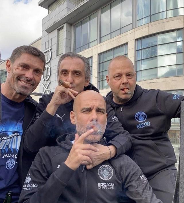 在夺冠游行的大巴上,51岁的瓜帅多次向街边两旁的曼城球迷挥手致意,并且不停送上飞吻。随后,他与教练组成员一起抽起了雪茄。瓜帅还露出了一副十分销魂的表情。这不由得让人想起此前安切洛蒂在皇马夺得西甲冠军后,同样也抽起了雪茄的霸气一幕。