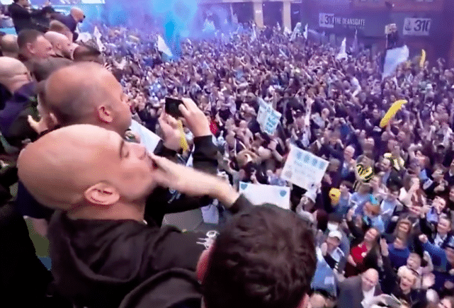 24直播网05月24日讯,曼城俱乐部在曼彻斯特市内举行了盛大的夺冠庆典和游行活动,这一日,曼城斯特彻底变成了蓝色。而曼城主帅瓜迪奥拉,也在夺冠庆典上“玩嗨”了。