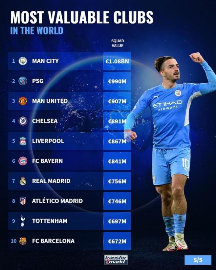24直播网10月26日讯 今日,德转更新了世界足坛各俱乐部身价,曼城以10.8亿欧总身价继续占据榜首。曼联排名第三。