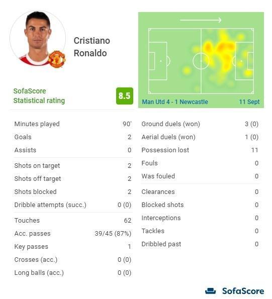 本场比赛C罗2次射正,2次打偏,2次射门被封堵,45次传球39次成功,成功率87%,没有过人,有1次关键传球,丢球权11次,3次地面对抗和1次空中对抗都失败了。