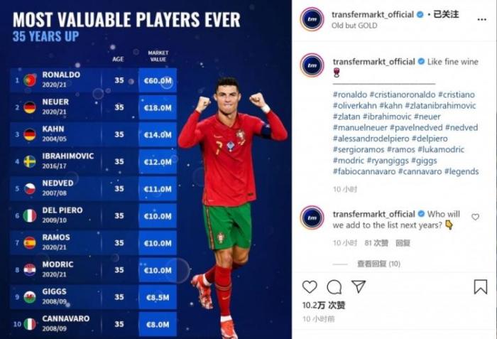 24直播网9月11日讯 今日,德国转会市场网盘点足坛史上球员在35岁时的身价排行,C罗以6000万欧排在第一位。