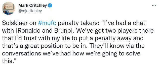 索尔斯克亚说:“我和C罗以及B费聊过这事,我们有两名值得我用生命信任的点球手,这很好。”