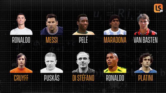 要入选这份计算名单,球员需要至少赢得两次金球奖,或者在1956年之前被公认为最伟大的球员。最终,C罗、梅西、贝利、马拉多纳、范巴斯滕、克鲁伊夫、普斯卡茨、迪斯蒂法诺、罗纳尔多和普拉蒂尼进入了10人对比名单。