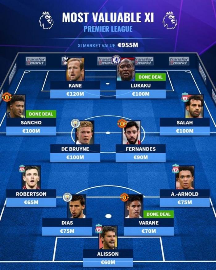 这个最贵阵容有2个曼城、3个曼联和4个利物浦球员,身价最高的凯恩来自热刺。