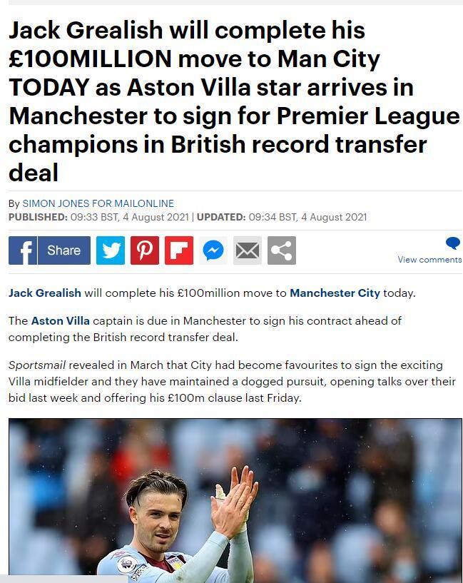 24直播网讯 今日,据英媒《每日邮报》消息,阿斯顿维拉队长格拉利什今天将与曼城签约,转会费1亿英镑。