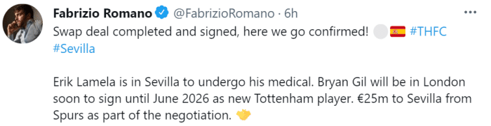 现在,拉梅拉已经抵达塞维利亚并正在接受俱乐部体检,吉尔也很快将前往伦敦接受热刺体检,随后双方将签约至2026年。