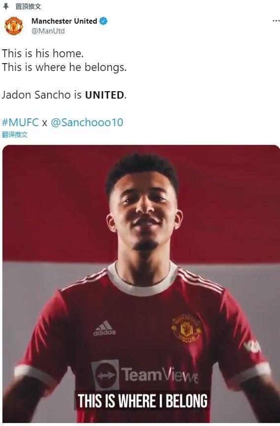 24直播网讯 今日,曼联官方消息,英格兰边锋桑乔正式加盟球队,固定转会费8500万欧元。