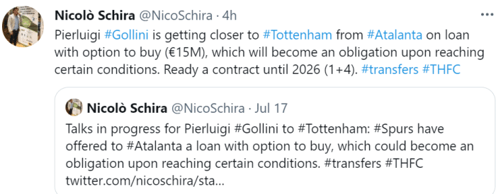 24直播网讯 据知名转会记者斯基拉报道,热刺接近租借签下亚特兰大门将戈里尼。