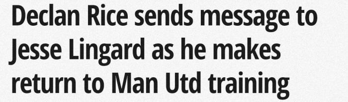 在林加德租借到西汉姆联后,林加德和赖斯这对英格兰中场组合是队友。现在林加德回到了老特拉福德,并在社交媒体上发布了自己的训练照,赖斯评论说:“我看到你了。”