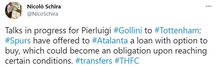 该记者表示,热刺租借戈利尼的谈判已经在进行中,租借合同中包含达成一定条件下强制买断。