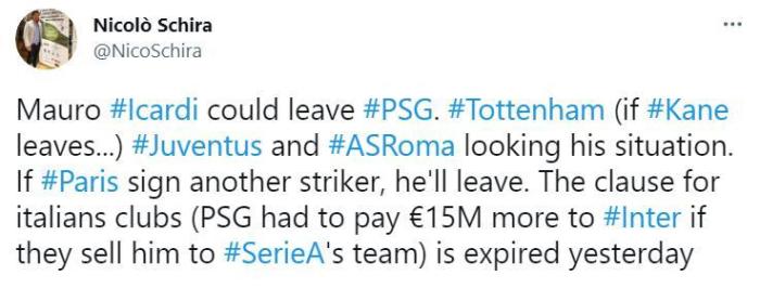 斯基拉表示,伊卡尔迪可能离开巴黎,如果凯恩离队的话,热刺有意引进他作为代替者。同时,尤文、罗马也在关注他的情况,如果巴黎再签下一名前锋的话,他们就会放伊卡尔迪离开。