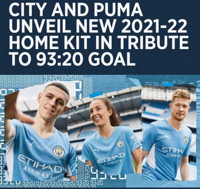 24直播网讯 北京时间7月14日,曼城官方发布了新赛季主场球衣,新球衣以阿圭罗93:20的进球为灵感而设计。