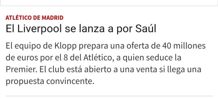 据西班牙媒体报道,萨乌尔在今年3月决定离开马德里竞技,拜仁慕尼黑曾计划引进他,对于利物浦来说,维纳尔多姆今夏将去巴黎,萨乌尔将是完美的替代者。