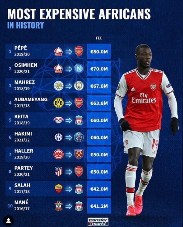 24直播网讯 今日,《转会市场》列出了非洲球员转会费榜单,其中马内排在第十,而阿森纳的N-佩佩以8000万欧领跑。