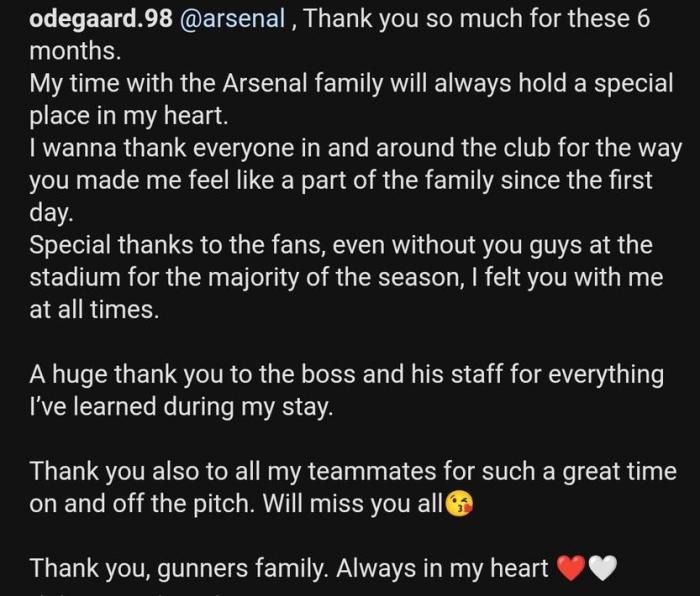 24直播网讯北京时间7月4日,厄德高结束了阿森纳租借生涯,挪威人在Ins上发文告别阿森纳。