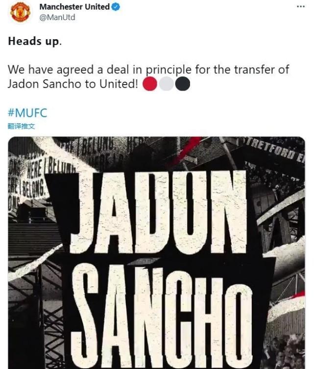 24直播网讯 北京时间7月1日晚,曼联官方宣布,与多特就桑乔转会达协议。曼联将为桑乔支付8500万欧元(7300万镑)的转会费。