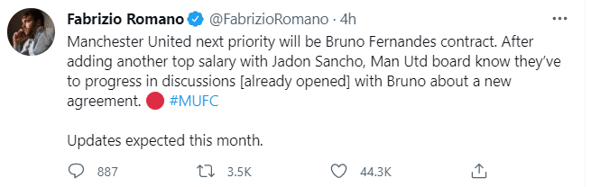 罗马诺: 签下桑乔后, 曼联首要任务是续约B费