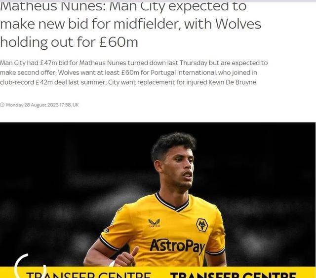狼队拒绝了曼城开出的4700万英镑的报价,他们坚持6000万英镑的标价。努内斯已告诉狼队他想离开俱乐部,《电讯报》和《The Athletic》报道称他周日和周一都没有训练。