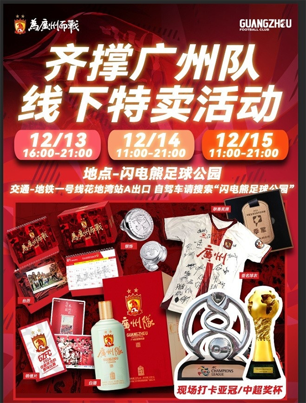 其中13日的活动时间为16时至21时,14日和15日因为是周末,活动时间统一为11时至21时。线下活动地点是闪电熊足球公园。在现场,广州队工作人员将售卖包括签名球衣、联赛奖牌在内的多种物品,还可以现场打卡亚冠和中超的奖杯。得知广州队举办本次售卖活动,广州死忠球迷们纷纷表示支持。