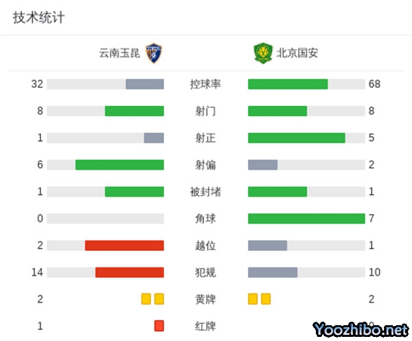 全场结束,云南玉昆主场0-2不敌北京国安。