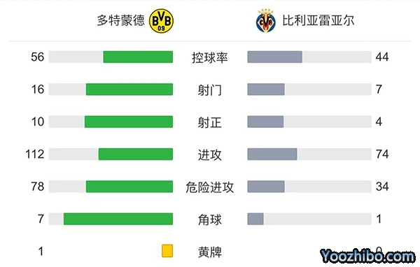 全场比赛结束,最终比利亚雷亚尔2-0击败多特蒙德。