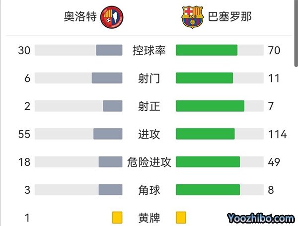 第45分钟,奥洛特获得点球!曼萨诺和队友二过一配合后禁区内被马莫尔放倒,裁判判罚点球并且向其出示黄牌,随后阿马加特主罚点球命中,奥洛特1-1巴萨。