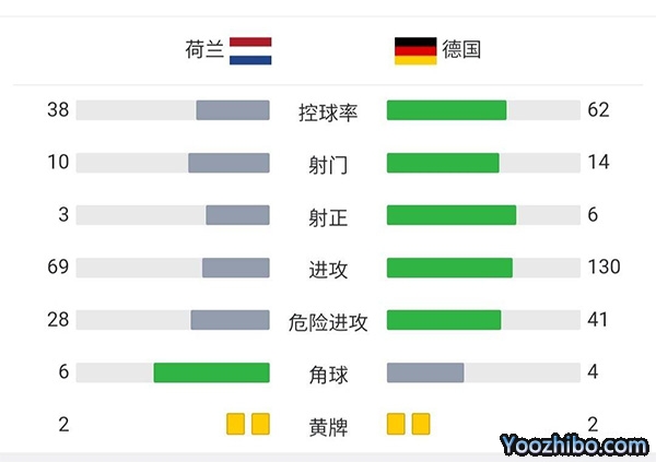 荷兰首发:1-弗莱肯、3-德里赫特、4-范戴克、17-布林德、22-邓里弗斯、20-库普梅纳斯、21-德容、6-马拉恰、11-博古伊斯、18-马伦、10-德佩